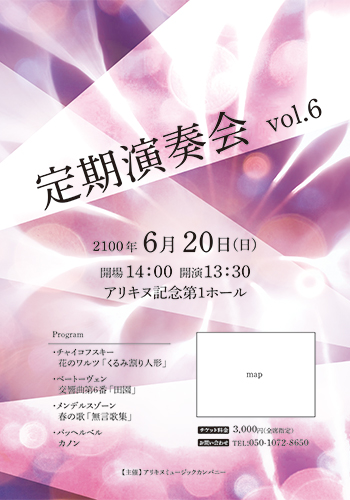 洗練された美しさと落ち着きをあわせ持つ、淡い紫色のエレガントな演奏会チラシテンプレートを作成しました。