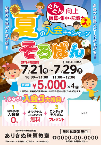 そろばん教室チラシ テンプレート番号:tem0003 ◆基本テンプレート お見積り依頼する場合は下記フォームにご入力ください。 後ほど、お見積りとデザインのご希望・掲載内容のお伺いを当店よりメール送信させていただきます。 当店のご利用について はじめての利用2回以上利用 必要なお見積り チラシ無し100部200部300部400部500部600部700部800部900部1,000部1,100部1,200部1,300部1,400部1,500部1,600部1,700部1,800部1,900部2,000部2,500部3,000部3,500部4,000部4,500部5,000部 納期 —以下から選択してください—通常短納期(追加料金) 印刷する面 —以下から選択してください—片面両面 デザインオプション 写真の美肌加工【無料】簡易地図作成【2000円】 印刷部数必須 10部20部30部40部50部60部70部80部90部100部200部300部400部500部600部700部800部900部1,000部1,100部1,200部1,300部1,400部1,500部1,600部1,700部1,800部1,900部2,000部2,500部3,000部3,500部4,000部4,500部5,000部 用紙の手触り必須 マット(しっとり)コート(光沢あり) 用紙の厚み必須 通常の厚み120%アップを希望【追加料金】 一般的には通常の厚みで問題ありませんが、しっかりした印象を与えたい場合は、厚みのアップをお勧めしています 担当者お名前必須 会社名 メールアドレス必須 電話番号必須 住所 郵便番号※半角入力で住所を自動入力 都道府県 市町村 番地・建物名など お問合せがあればご記入ください your message here ... 必ずチェックを入れてから送信してください このフィールドは空のままにしてください。 Δ テンプレート番号:tem0003