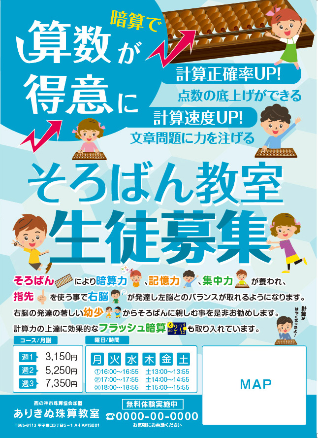 そろばん教室チラシ テンプレート番号:tem0007-02 ◆基本テンプレート お見積り依頼する場合は下記フォームにご入力ください。 後ほど、お見積りとデザインのご希望・掲載内容のお伺いを当店よりメール送信させていただきます。 当店のご利用について はじめての利用2回以上利用 必要なお見積り チラシ無し100部200部300部400部500部600部700部800部900部1,000部1,100部1,200部1,300部1,400部1,500部1,600部1,700部1,800部1,900部2,000部2,500部3,000部3,500部4,000部4,500部5,000部 納期 —以下から選択してください—通常短納期(追加料金) 印刷する面 —以下から選択してください—片面両面 デザインオプション 写真の美肌加工【無料】簡易地図作成【2000円】 印刷部数必須 10部20部30部40部50部60部70部80部90部100部200部300部400部500部600部700部800部900部1,000部1,100部1,200部1,300部1,400部1,500部1,600部1,700部1,800部1,900部2,000部2,500部3,000部3,500部4,000部4,500部5,000部 用紙の手触り必須 マット(しっとり)コート(光沢あり) 用紙の厚み必須 通常の厚み120%アップを希望【追加料金】 一般的には通常の厚みで問題ありませんが、しっかりした印象を与えたい場合は、厚みのアップをお勧めしています 担当者お名前必須 会社名 メールアドレス必須 電話番号必須 住所 郵便番号※半角入力で住所を自動入力 都道府県 市町村 番地・建物名など お問合せがあればご記入ください your message here ... 必ずチェックを入れてから送信してください このフィールドは空のままにしてください。 Δ テンプレート番号:tem0007-02